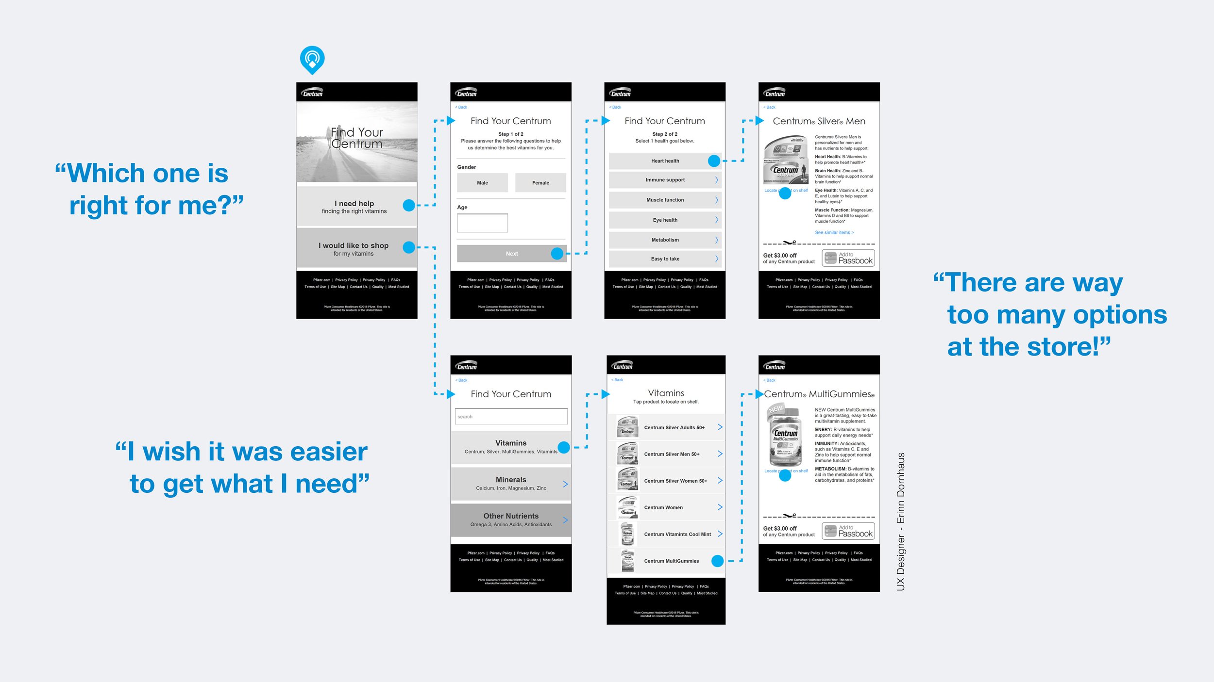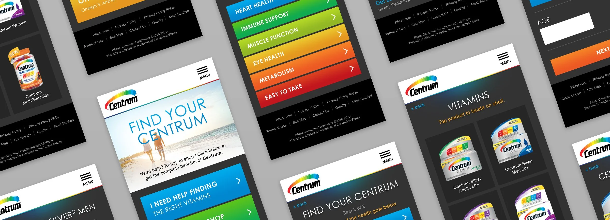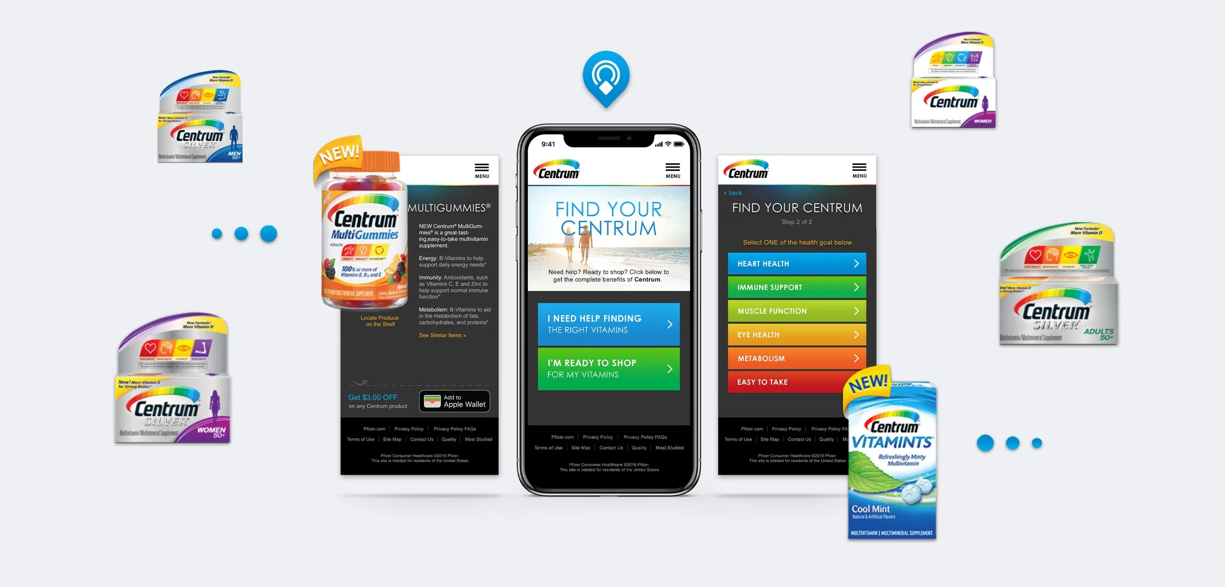 We delivered an elevated “Physical Web” retail experience that would guide customers through the deep roster of Centrum products that are available. Utilizing in-store signage, LED lights, a Raspberry Pi, and beacon technology the customer can use their phone to take and quiz and locate the correct product on the shelf.